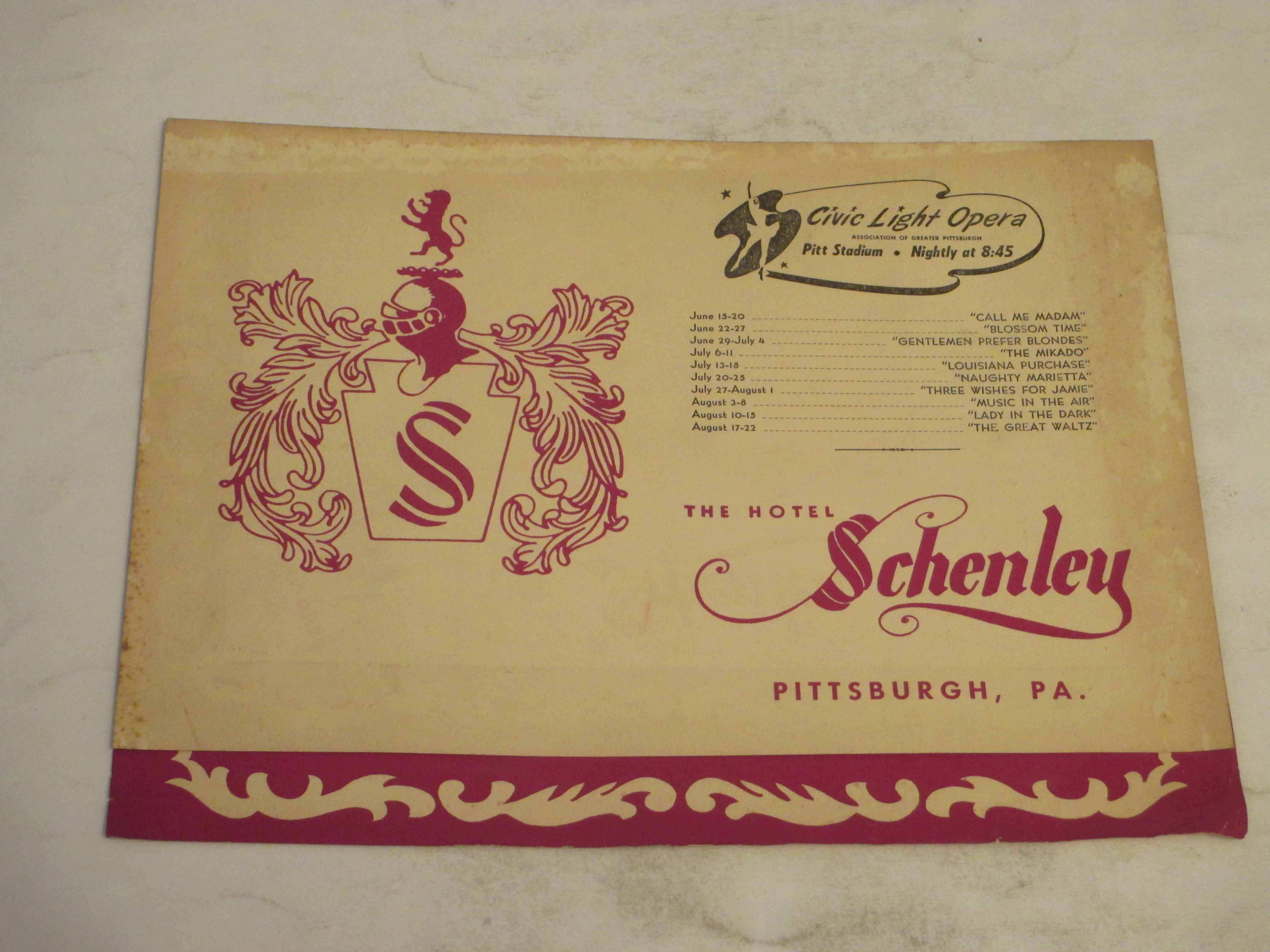 hotel schenley menu- lost Pittsburgh,pa 1950's, also mentioning