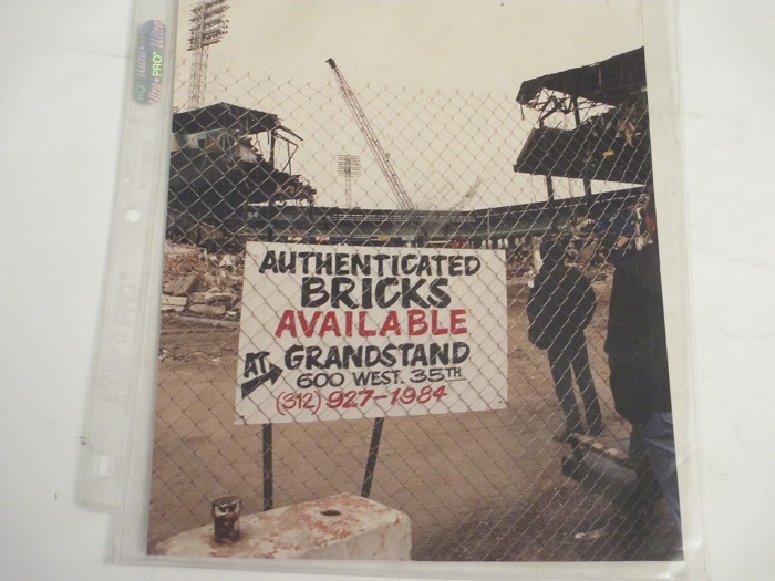 color photo notes crane tearing down location of the park, Chicago white sox, with sign to purchase surviving bricks at grandstand