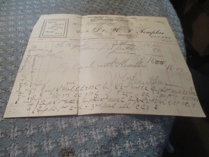 Dr. W.F. Templar, Dentist 12/1902 Bill Dental Services