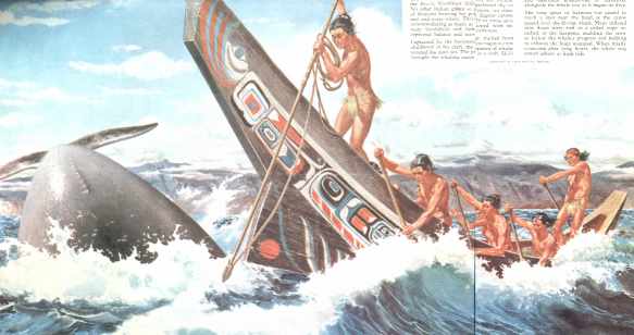 Courtesy of Your Pontiac Dealer - copyright 1956, beautiful full color art print titled: Primitive Drama of the Sea, Pacific Northwest Indians deep sea hunting for whale. 16.25x11" full print does not show in the pic. Pic is stitched from two scans and might show a line that isn't on the print itself. Creased