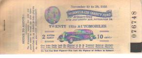 Book of Raffle tickets for November 18 to 29, 1935, Rev. James R. Cox Charity Fund at Shanty Town, Pittsburgh, PA, for 20 1935 automobiles. 6.5x2.7" cover and nine tickets. cover slightly faded, excellent condition