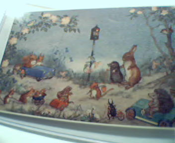 by the Medici Society in London, Printed in England, Great Image of Various Woodland Animals in Vehicles or Walking to a Traffic Light at a four way corner, Unused, Slight Wear,Overall Good Condition! lt